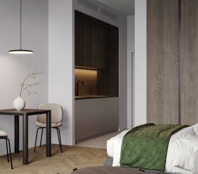 Inside, the residences are a showcase of refined simplicity and elegant design. The project offers a selection of studios, 1-bedroom, 1.5-bedroom, and 2.5-bedroom apartments, each with spacious layouts and soft, neutral interiors. Large windows invite sunlight into every corner of the home, while natural wood accents and clean finishes create a warm, welcoming ambiance. Every apartment is designed to promote comfort and sophistication, ideal for those who value both style and function in their everyday living.