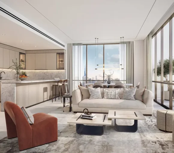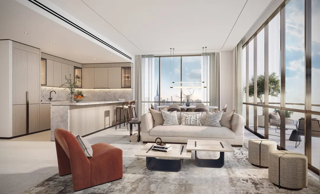 Atélis is a striking new residential landmark envisioned by the acclaimed architects Skidmore, Owings & Merrill (SOM). Inspired by the elegance and resilience of a desert flower, the architectural design features fluid, petal-like balconies that create a visually captivating and organic silhouette. This refined aesthetic is carried through to the interiors, where sweeping curves and a warm, natural palette are enhanced with subtle bronze accents, offering residents a serene and sophisticated living experience.