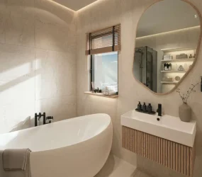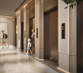 The interiors of Azure are defined by premium materials, modern finishes, and refined decorative elements that mirror the project’s calm, elevated character. The lobby showcases polished surfaces, soft lighting, and warm textures, creating an inviting sense of arrival. Residences feature contemporary design details with clean lines and elegant tones.