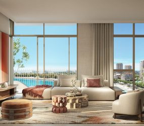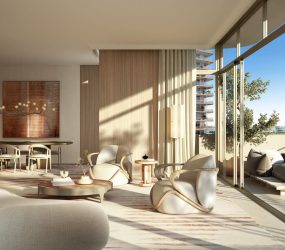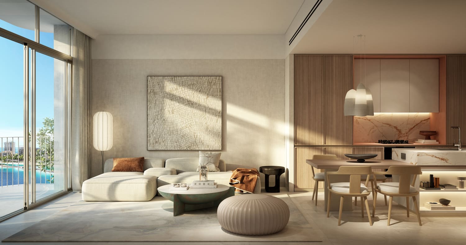 The residences include 1-, 2-, 3-, and 4-bedroom apartments, as well as an exclusive penthouse, all framed by expansive terraces and floor-to-ceiling windows. Elegant interiors showcase warm wood textures, light stone finishes, and soft, modern tones that reflect the serenity of island life. Building 15 stands as a centerpiece, offering premium 4-bedroom homes and private lobbies, while every unit is thoughtfully designed to blend privacy, comfort, and timeless style.