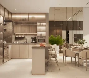 The interiors are crafted with exceptional attention to detail, integrating premium international brands that elevate both aesthetics and functionality. Residences feature a fully integrated Alexa smart-home system, frameless Bertolotto doors, Scavolini kitchens with Italian travertine countertops, Dornbracht sanitary fittings, and high-performance aluminum systems by Gutmann, complemented by luxury furnishings and refined finishing elements. Homes come semi furnished with kitchen appliances from leading global brands, including Bosch, Scavolini, Dornbracht, Legrand, Gutmann and others used across the developer’s portfolio. These elements ensure a sophisticated living environment and a consistent standard of quality throughout all AYS projects.