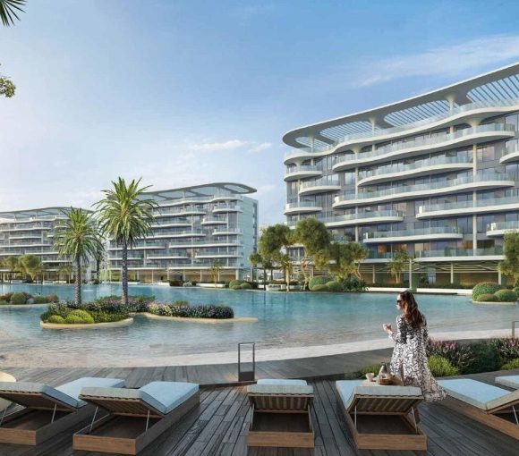 Marvel at sleek, curved exteriors by the lagoon, where Mediterranean living meets luxury amidst serene water features and greenery, with sweeping balconies seamlessly blending indoor and outdoor spaces.