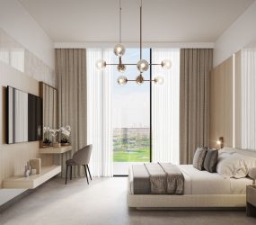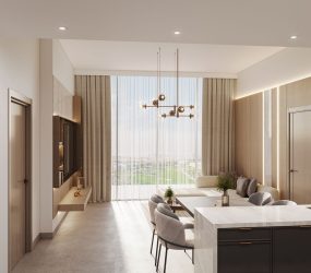 Crafted for comfort and elegance, the bedrooms features spacious interiors and exquisite furnishings. Floor-to-ceiling windows invite natural light and offer stunning views. Clean lines and a neutral color palette create an open, inviting atmosphere. Designer lighting and tasteful decor add a luxurious touch. The seamless connection to a private terrace offers an exclusive retreat linked to personal space. Apartments also equipped with the latest smart home technologies.