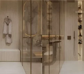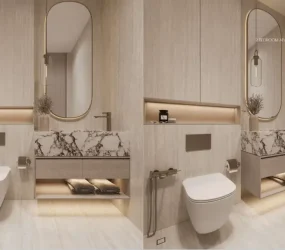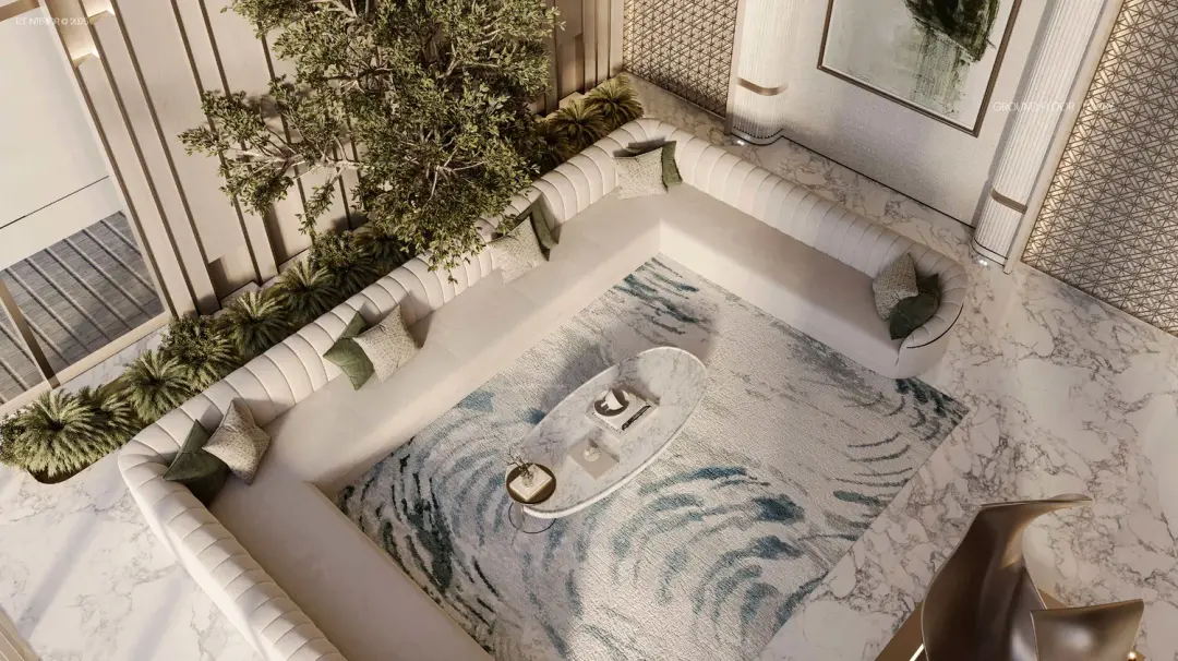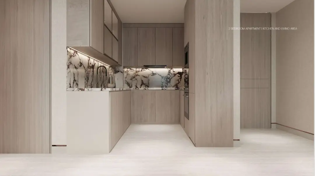 Interiors are crafted with high-quality materials, including textured wall coverings, Italian porcelain flooring, bespoke joinery, and natural-toned palettes. Kitchens feature Italian quartz islands, refined cabinetry, and branded appliances by Miele and Bosch, delivering performance and craftsmanship consistent with European standards. Bathrooms include rose-gold fixtures, Italian quartz feature walls, and ambient lighting that enriches the project’s elegant, calming aesthetic.