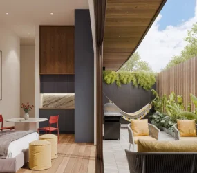 Inside, the residences are designed around the idea of balance and openness. Expansive layouts, double-height ceilings, and continuous exterior views invite natural light to define each space, creating interiors that feel fluid, calm, and connected. The material palette blends rich natural finishes with elegant stone and marble tones, enhanced by integrated smart lighting, bespoke cabinetry, and premium appliances forming a living experience that is as practical as it is beautiful.