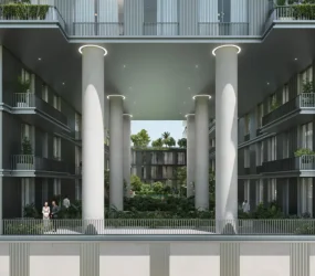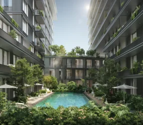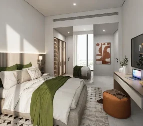 The residences offer a selection of one, two, and three-bedroom apartments crafted with understated luxury and functional sophistication. Interiors are defined by serene palettes of white, grey, and natural wood, open-plan layouts, and soft textures that enhance comfort and connection. Bedrooms feature built-in wardrobes and warm finishes, while kitchens and bathrooms balance calming tones with premium materials, creating harmonious living spaces designed for everyday ease and refined living.