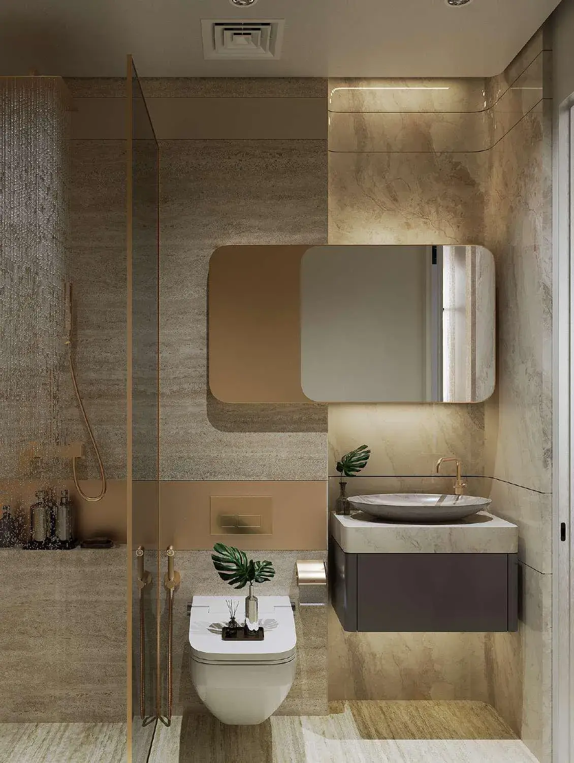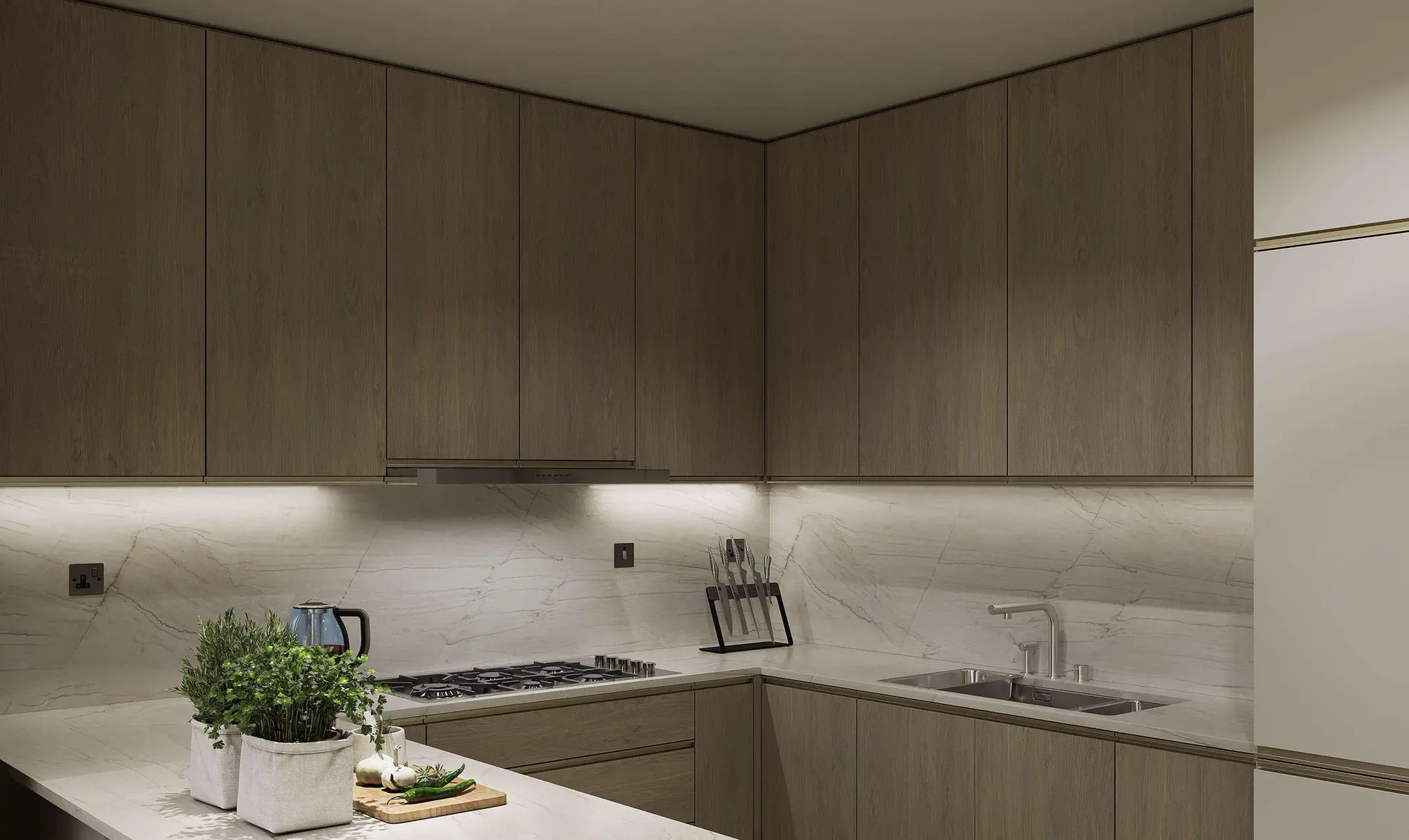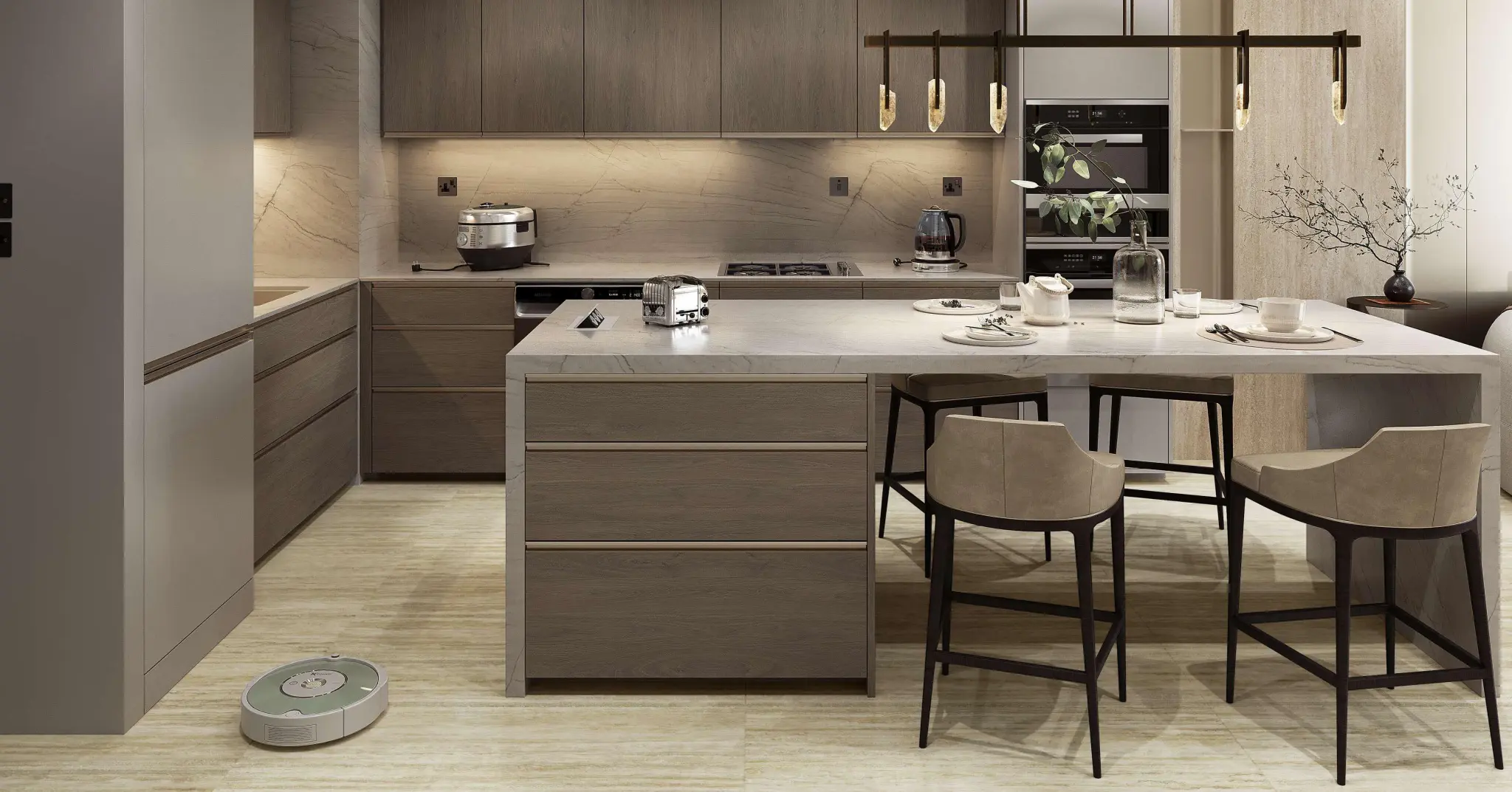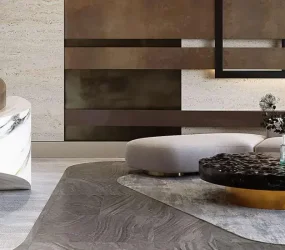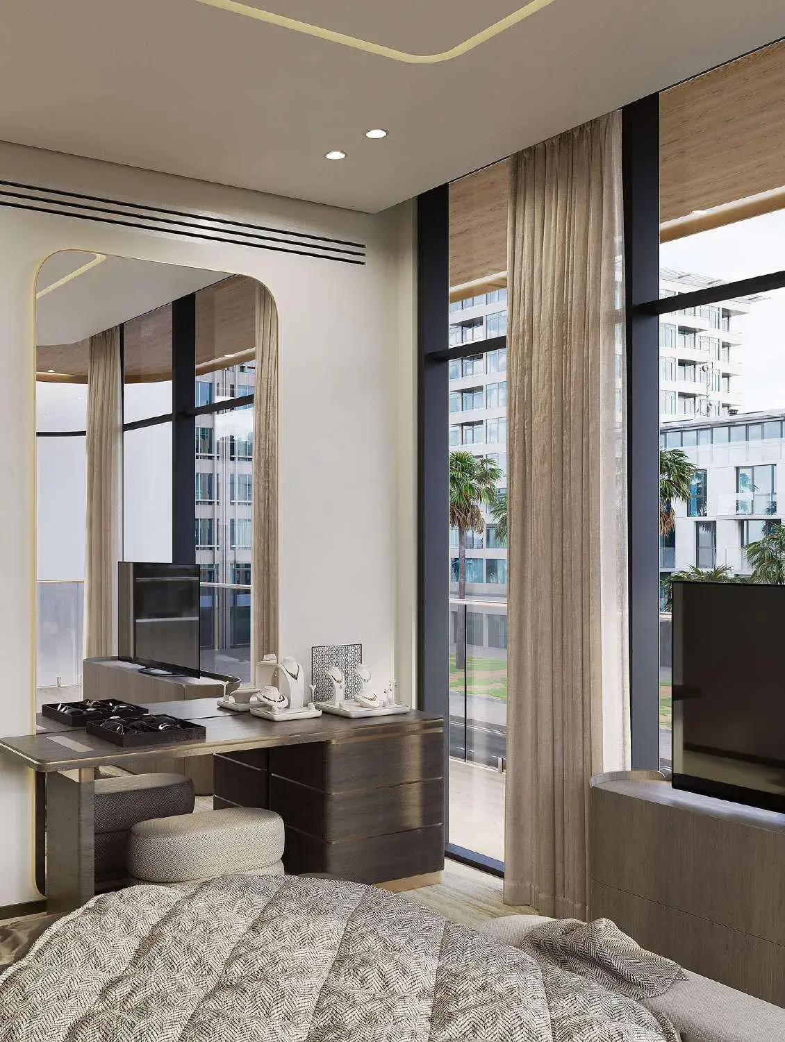 The residential offering includes studios and one-, two-, and three-bedroom apartments designed with spacious layouts and refined detailing. Interiors are finished in a modern style using porcelain floor tiles with a marble look, matching porcelain skirting, plastered walls with emulsion paint, accent walls with wallpaper or equivalent finishes, and gypsum ceilings. Wardrobes and kitchen cabinetry are crafted from MDF joinery with laminate finishes, while kitchens feature engineered stone or quartz countertops and come equipped with German-quality appliances, including oven, cooker or hob, hood, fridge, and washing machine from Siemens, Bosch, or equivalent brands. Bathrooms are fitted with premium sanitaryware from Kohler, Duravit, or equivalent, completing homes defined by quality, durability, and timeless elegance.