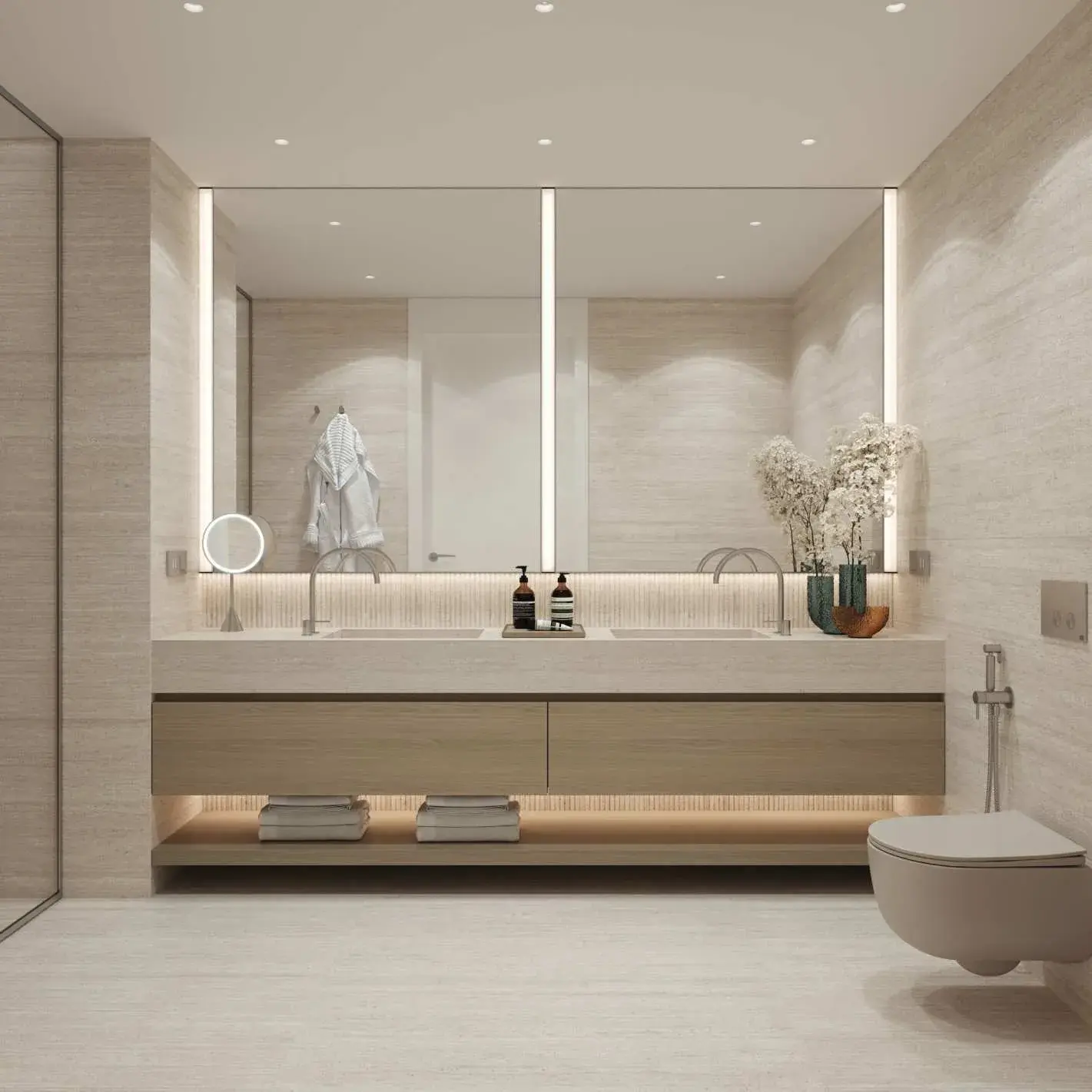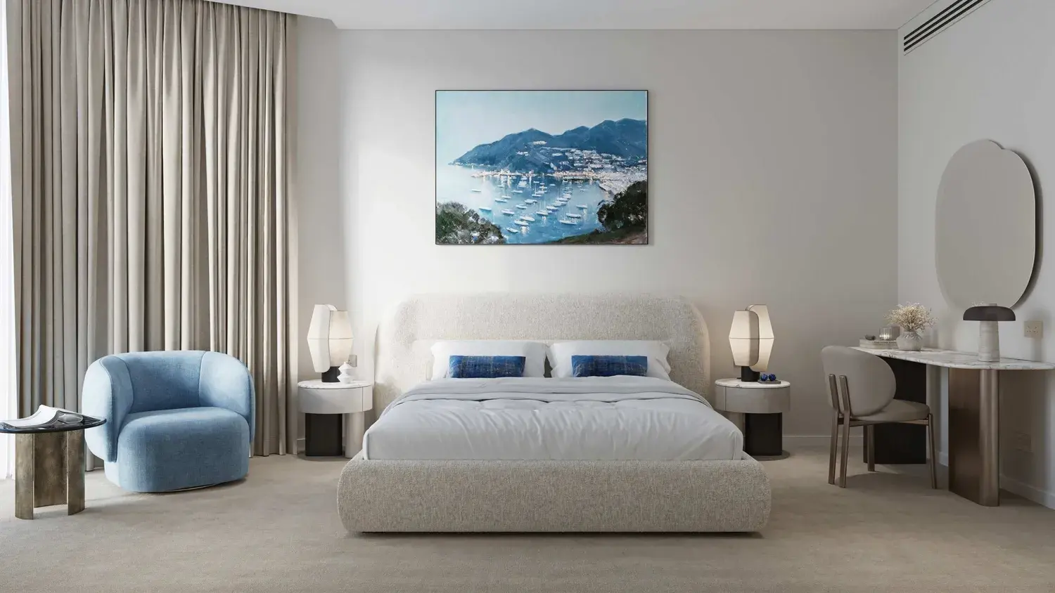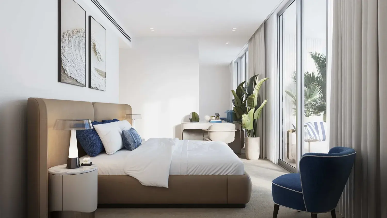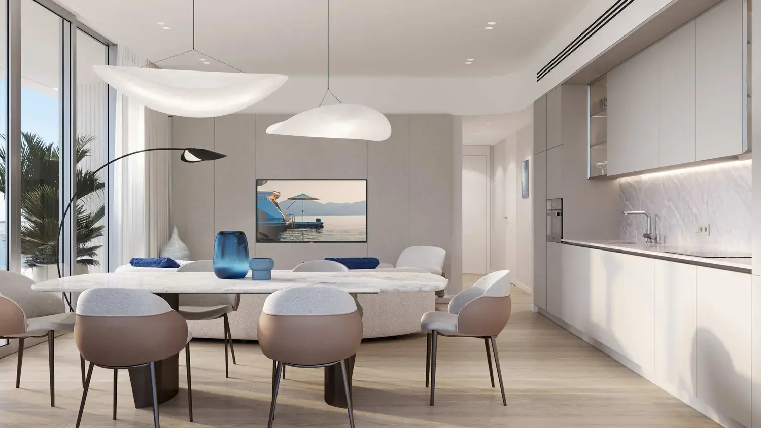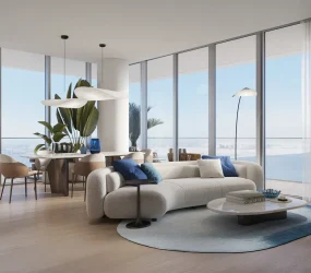 Residences are finished in a contemporary style with refined, high-quality materials and an emphasis on light, texture, and proportion. Interiors feature floor-to-ceiling glazing, elegant surfaces, and carefully selected finishes that reflect a calm, coastal palette. Kitchens are fully fitted with integrated cabinetry, stone countertops, and built-in appliances. The project is delivered unfurnished, allowing residents to personalize their living spaces while benefiting from premium base specifications throughout.