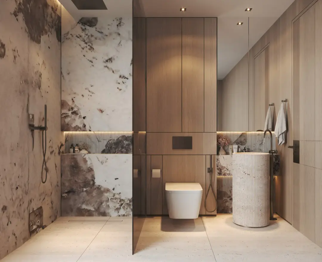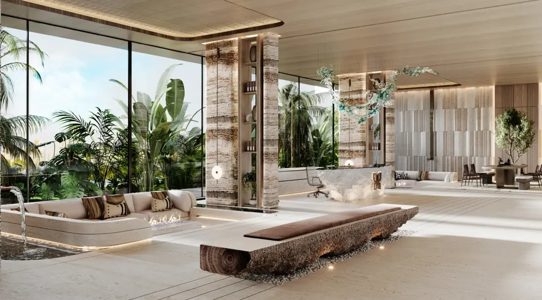 Residences at Soléva Beach are fully furnished, featuring a soft, neutral interior palette enriched with natural stone, wood accents, integrated shelving, custom joinery, soft textiles, and warm lighting. Living spaces include floor-to-ceiling glass, curated furniture, accent rugs, and seamlessly concealed storage for a clean aesthetic. Bedrooms are designed with built-in storage and integrated lighting, while bathrooms incorporate stone vanities, rainfall showers, textured wall finishes, and warm metal fixtures. Two-bedroom units include private pools with curated outdoor furniture.