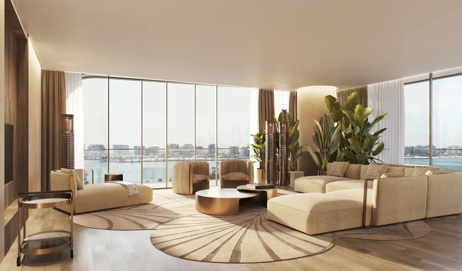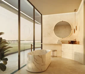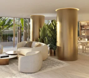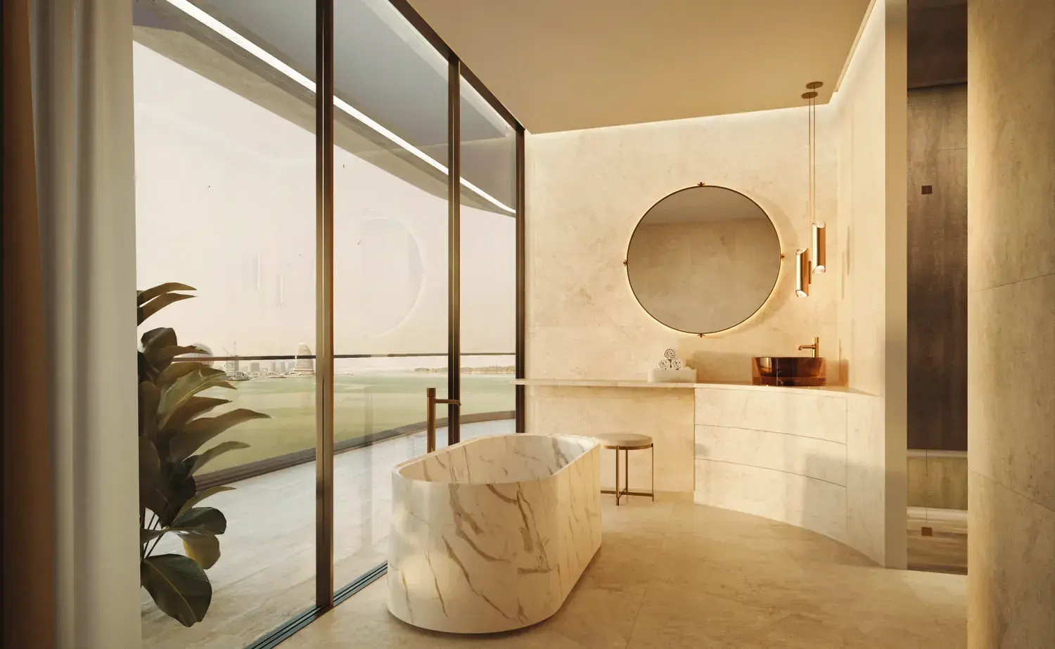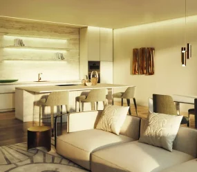 Interiors reflect Elie Saab’s distinctive design language, characterized by refined material contrasts, soft tonal palettes, and sculptural detailing. Finishes include white travertine surfaces, light oak wood, and subtle bronzed accents, creating a warm yet contemporary atmosphere. Kitchens are designed as elegant, functional spaces with integrated cabinetry, stone countertops, and refined detailing that aligns with the overall interior aesthetic. Residences feature curated furnishings and décor from the Elie Saab Maison collection, crafted in Italy, offering a fully coordinated interior environment defined by timeless elegance, craftsmanship, and understated luxury.