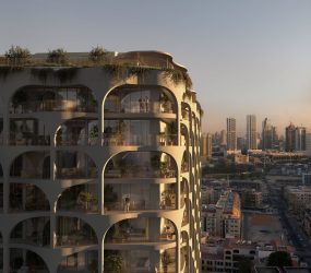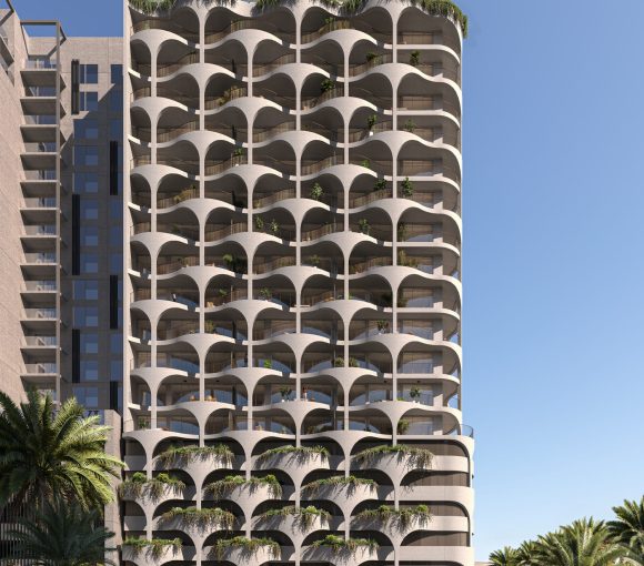 Its distinctive façade is inspired by the intricate weaving of palm fronds, highlighting the versatility and beauty of natural materials found in the Middle Eastern landscape. Across the façade, intertwining balconies give way to beautiful homes that exude warmth and peace.